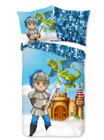 Ga elke nacht op een spannend avontuur met dit heldhaftige dekbedovertrek, versierd met een dappere ridder, een vuurspuwende draak en een betoverend kasteel. De kleurrijke tekening neemt je mee naar een wereld vol fantasie, moed en magie – waar je draken verslaat en kastelen verovert in je dromen. Perfect voor stoere dromers met een groot hart!