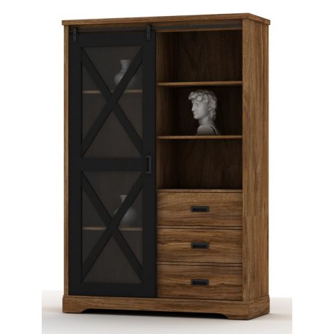 Deze industriële vitrine in een folie van mangohout past in elk hedendaags interieur. Voorzien van twee legplanken in het rechtergedeelte en drie legplanken in het linkergedeelte. Drie lades met ladengeleiders.